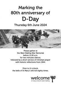 Prior to 11 o’clock, a bell will be tolled eighty times to mark the 80 years since the 6th of June 1944 and the start of the liberation of Europe. Then you are welcome to gather with us at the West Malling War Memorial before 11 a.m. for two minutes silence, followed by a short service of Christian prayer with historic reflections from 1944.